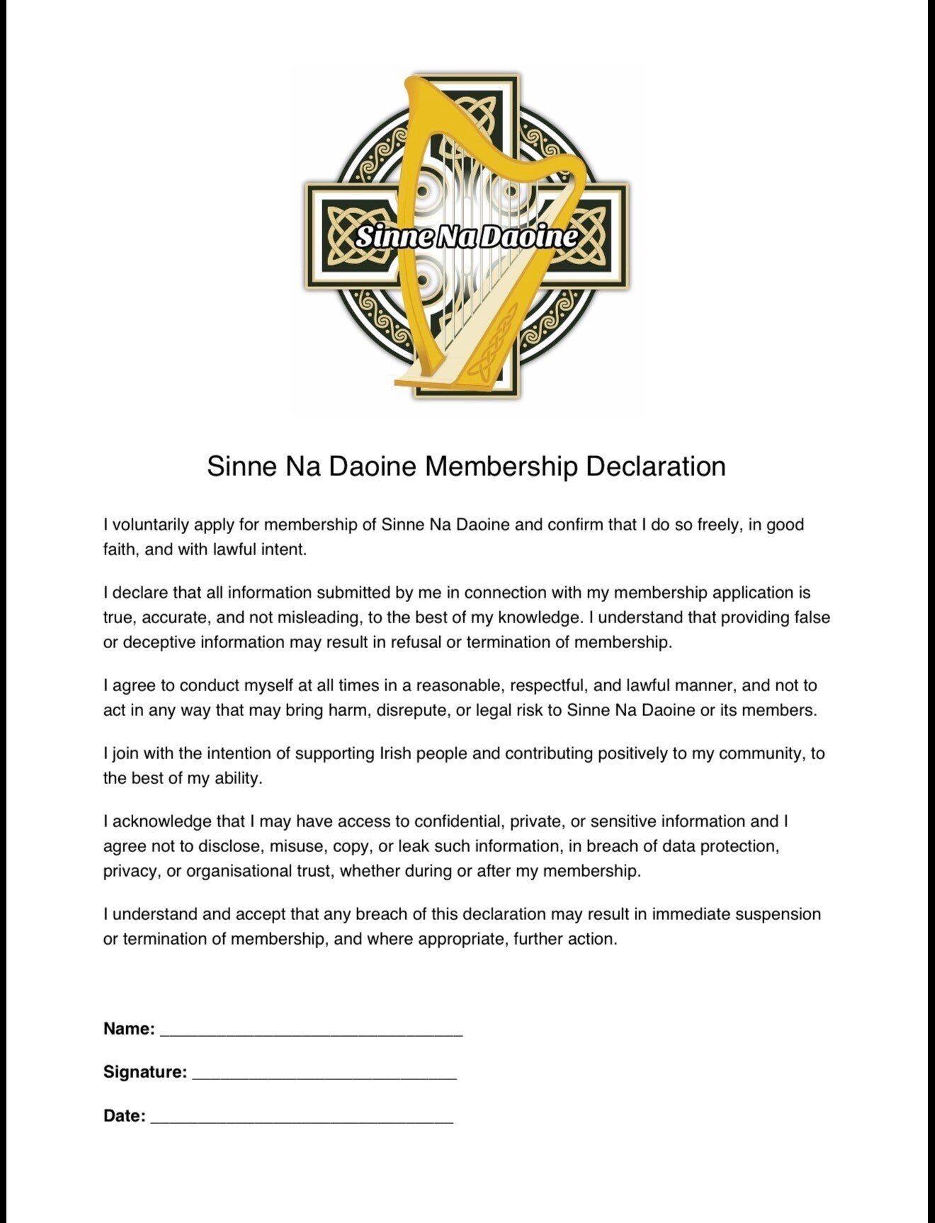 Sinne na daoine membership declaration, applicable to all members.